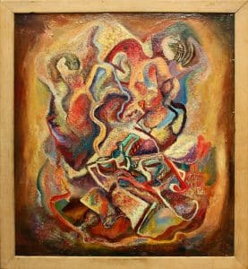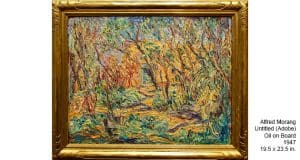 Alfred was born in Ellsworth, Maine in 1901 and came to Santa Fe in 1937. Like many who came here he suffered from TB. He immediately became a fixture in the Santa Fe art scene. He wrote a weekly column for the newspaper and he produced a weekly radio program for 17 years on KVSF called “The World of Art with Alfred Morang.” Most of all he was famous for his enthusiasm for art and his ability to teach and many benefited from “The Morang School of Fine Art”.