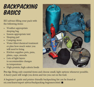 You will have to invest in a few things, however, like hiking boots or trail runners, and perhaps a backpack to make sure it fits you properly. You will also need to borrow or purchase a few backpacking essentials, which can vary depending on the scope of the trip, according to Ron. “My best advice is to read a beginner’s guide to backpacking from a reputable outdoor sports outlet like REI,” Ron said. “They, and many others, have beginner articles including a required and optional gear list for backpacking.”
