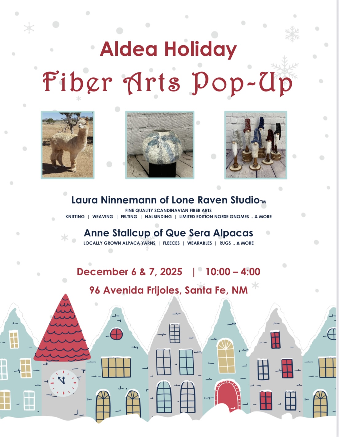 Celebrate the season at the Aldea Holiday Fiber Arts Pop-Up, happening December 6 & 7, from 10:00 AM to 4:00 PM at 96 Avenida Frijoles, Santa Fe, NM. This festive event features the beautiful work of Laura Ninnemann of Lone Raven Studio™, known for her fine quality Scandinavian fiber arts — including knitting, weaving, felting, nalbinding, and her beloved limited-edition Norse gnomes — along with Anne Stallcup of Que Sera Alpacas, offering locally grown alpaca yarns, fleeces, wearables, and rugs. Come explore handcrafted treasures, meet the artists, and find the perfect holiday gifts while supporting local makers and sustainable fiber traditions.