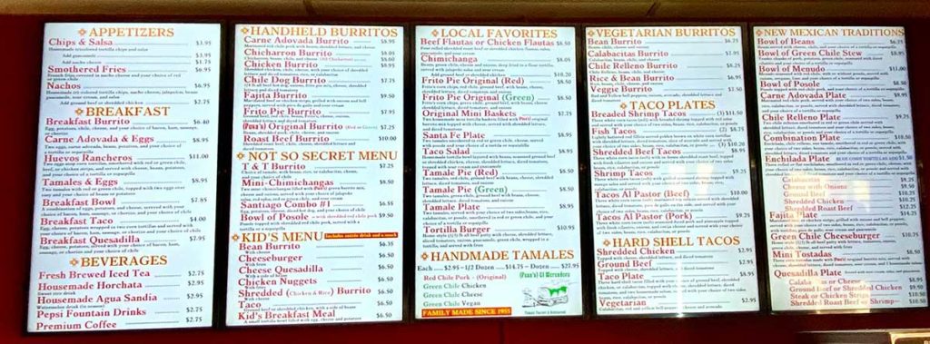 The staff puts together most any combo of meat and/or bean burritos, handheld or plated and smothered. The namesake Posa’s comes with shredded pork, beans, cheese, and chile. They offer a Frito pie burrito too, with the traditional pie fixings filling the tortilla. If you’re reading this on St. Patrick’s Day, there’s a corned beef burrito with — of course — green chile. Enchiladas, hard and soft tacos, and fajitas are also available. All come with flour tortillas or poofy sopaipillas, a touch sweet, but always good with honey as well. This is one place where side options always include calabacitas with green chile and corn along with the more usual beans, posole, or rice.